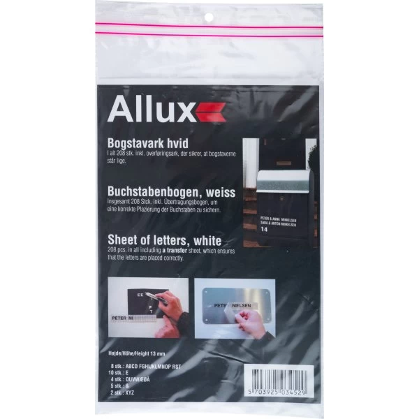 Med en pakke af de flotte foliebogstaver fra Allux, kan du nemt og hurtigt sætte navn på postkassen i privaten eller på jobbet. Bogstaverne er produceret specielt til at fungere som postkassebogstaver. Det vil sige, at de er fortrinlige til at holde i mange år i regn, slud og blæst. De giver dig en ubeklagelig klæbeevne og holder deres flotte skinnende farve i mange år frem.