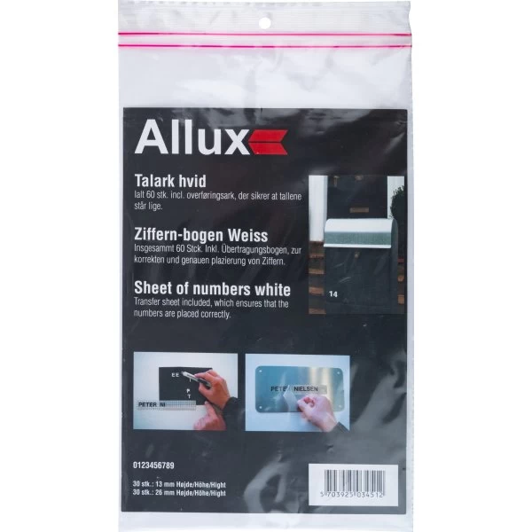Med en pakke af de flotte folietal fra Allux, kan du nemt og hurtigt sætte nummer på postkassen i privaten eller på jobbet. Tallene er produceret specielt til at fungere til postkasser. Det vil sige, at de er fortrinlige til at holde i mange år i regn, slud og blæst. De giver dig en ubeklagelig klæbeevne og holder deres flotte skinnende farve i mange år frem.