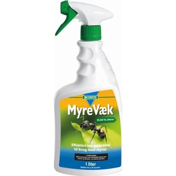 BONUS® MyreVæk er en myrebekæmpelse, som kan bruges direkte på myreboet eller der hvor de færdes i- og ved boligen, på terrasser mm.