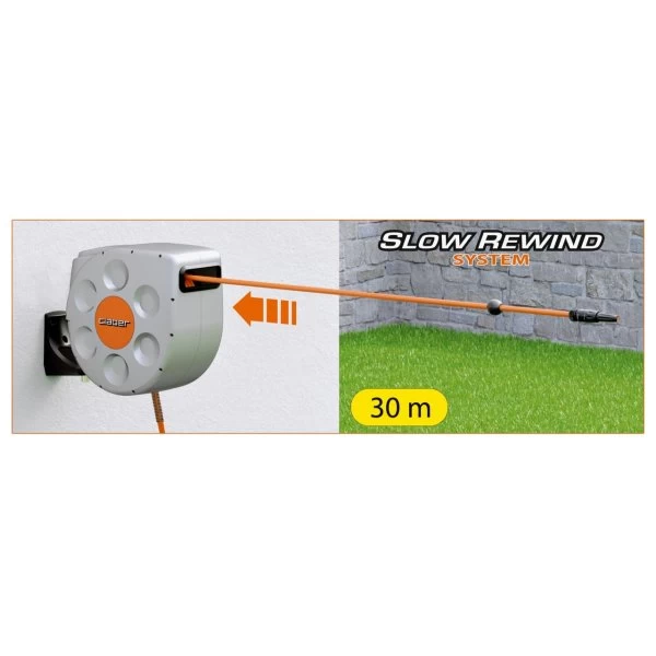 Slangerulle med automatisk tilbagespoling og eksklusiv “Soft Block® System” mekanisme.