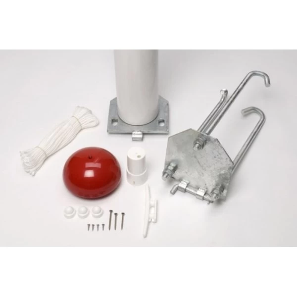 Flagstangen leveres inkl. rød uv-stabil plastknop, plast-topbeslag, line, selvlåsende lineholder og møtrikbeskyttere. Vippebeslaget er varmgalvaniseret og leveres samlet.