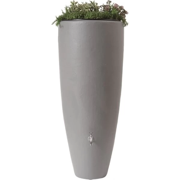 Regnvandsbeholderen kan både bruges som regnvandsbeholder og krukke i haven.