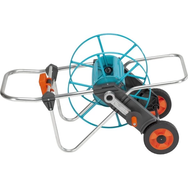 Slangekoblingen i vognen er vinklet og sikrer at slangen ikke bøjes og at vandgennemstrømningen altid er optimal. Derudover udstyret med solide profilhjul, der gør det nemt at skubbe tromlen.