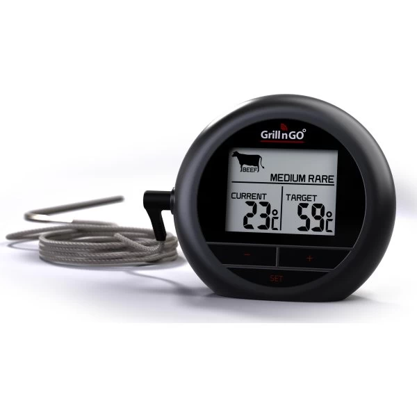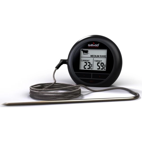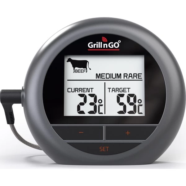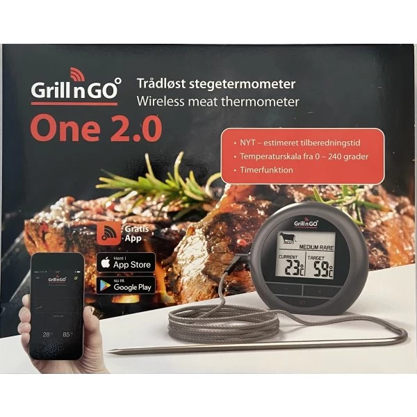 Er en videreudvikling af vor første Grill’n’go stegetermometer. Denne nye model er opdateret med 2-vejs kommunikation, så du nu fra app’n af kan vælge eller andre target tempeatur, kødtype etc. Kender du ovnrummets temperatur indtaster du dette i app’n, og app’n beregner den estimeret sluttid baseret på temperaturen i kødet og tilpasser denne undervejs ved at overvåge varmeudviklingen.