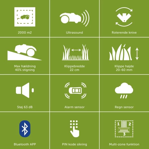 Dette er den store model til den helt store have eller måske park, da den kan bevæge sig over et 2000 m² stort område, indstilles til flere zoner og kan tilmed kontrolleres med app. Den kan køre op ad 40% hældninger, og den klipper jævnt og fint over det hele, når dit græs trænger.