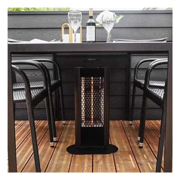 HEAT1 ECO high-line terrassevarmer til under bordet har ekstra høj ydeevne og mulighed for individuel temperaturregulering i 6 trin, fra 400W – 1200W og det kan gøres fra den medfølgende fjernbetjening.