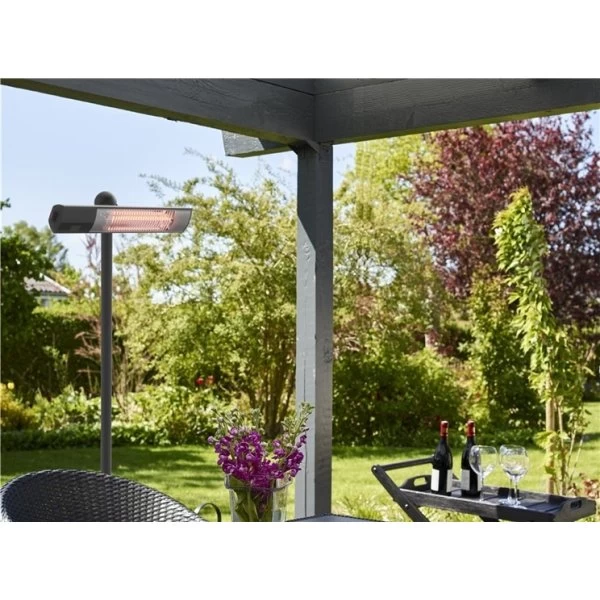Effektiv fritstående HORTUS infrarød kortbølge terrassevarmer. Ideel til placering på terrassen, i udestuen eller på altanen. Placeres terrassevarmeren for enden af en bord giver den behagelig varme i en afstand af op til 5 m2. 1500W ultra low glare halogen rør med en levetid på ca. 7000 timer.