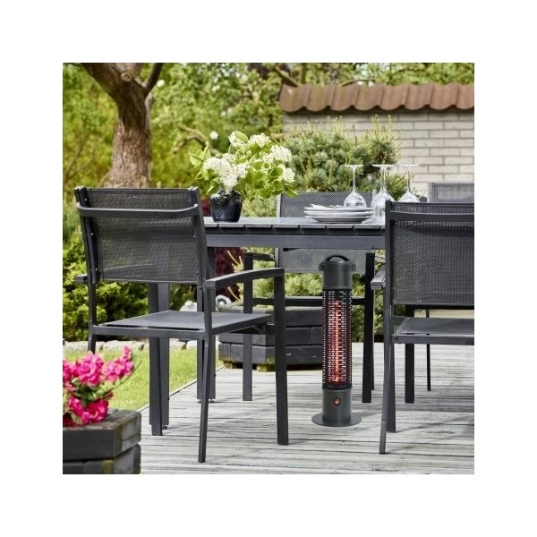 Modellen til placering under bord er perfekt til at sikre en god varme nedefra, så I kan nye en dejlig sommeraften på terrassen med lune ben. Denne HORTUS terrassevarmer under bord model spreder varmen 360 grader med en kortbølge infrarød ultra low glare rør. Bunden og toppen er fremstillet i pulverlakeret stål og det sorte rør i aluminium.