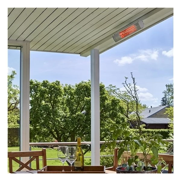 Væghængt HORTUS infrarød kortbølge terrassevarmer i smart og slankt design – ideel til montering under markiser og tagudhæng.
