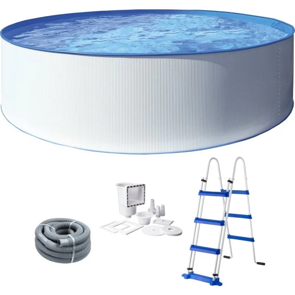 - Inkl. Stålvægspool, PVC liner, Skimmersæt, 3-trins sikkerhedsstige