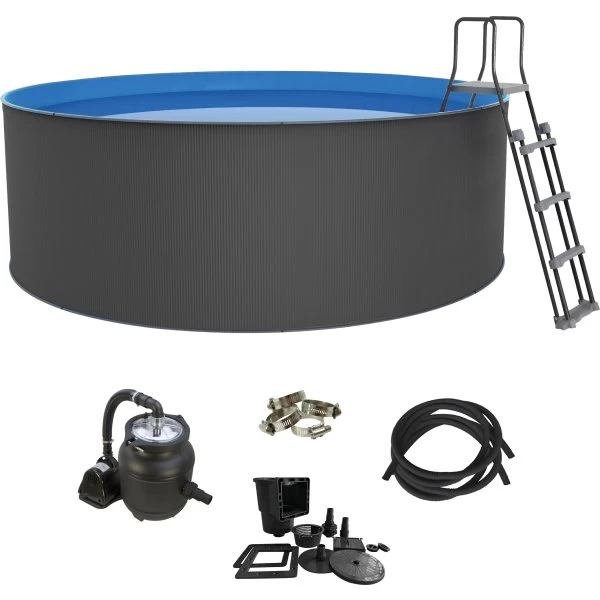 - Inkl. Stålvægspool, PVC liner 0,30 mm, skimmersæt, filtersystem 100w m. slanger og spændebånd, 340g filterballs, 3-trins sikkerhedsstige