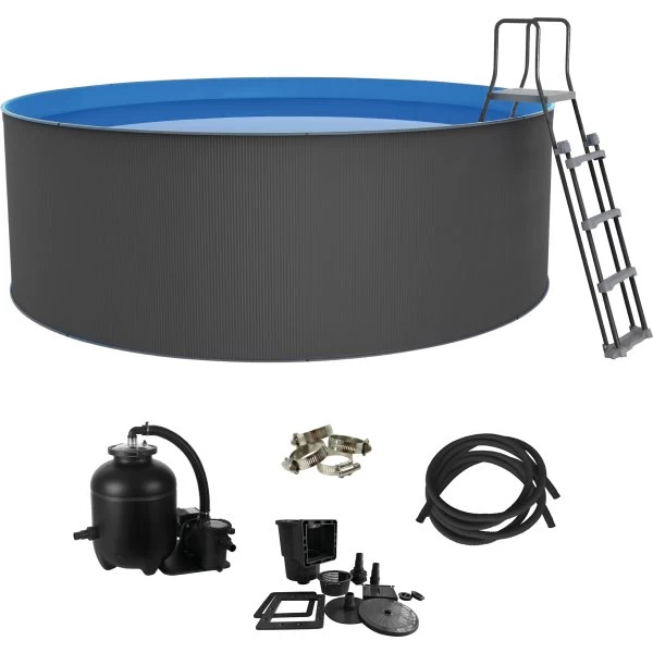 - Inkl. Stålvægspool, PVC liner 0,30 mm, skimmersæt, filtersystem 300w m. slanger og spændebånd, 1200g filterballs, 3-trins sikkerhedsstige