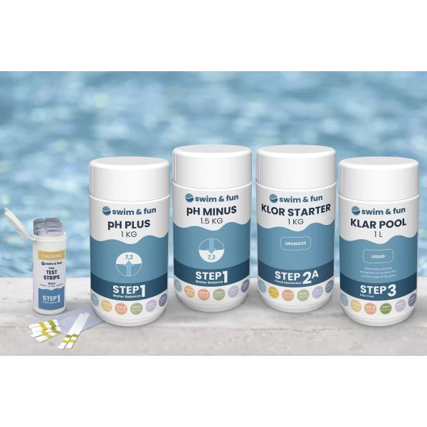 Denne pakke indeholder alle de plejemidler der er nødvendige for at holde vandet i poolen rent og indbydende.