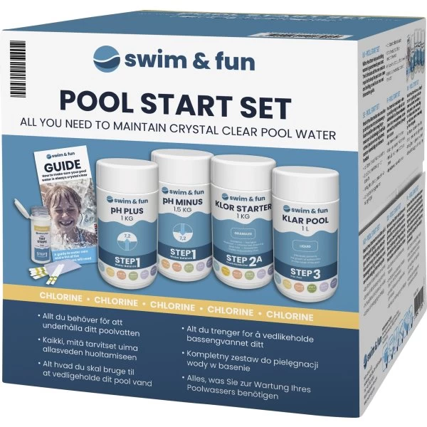 Sættet indeholder Klor Starter til desinfektion af vandet, test ttrips til nemt at teste pH værdi og klorindhold, pH-Plus og pH-Minus til at justere pH-niveauet og KlarPool til forebyggelse af belægninger.